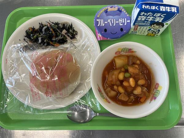 今日は「目の愛護デー」です。字の10を横にすると目とまゆげに見えることから「目の愛護デー」となりました。今日は目の愛護デーにちなんで、目に良い食べものの「ブルーベリー」を献立に取り入れました。ブルーベリーのきれいなむらさき色の成分「アントシアニン」は目の働きを良くしてくれます。ブルーベリーゼリーを食べて、目の健康を考えましょう。