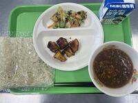 今日の給食「ジャージャーめん」は、汁気が少なく、油で炒めた具入りのみそとちゅうかめんを和えて食べる料理です。給食では、「京桜みそ」という色の濃いみそと、辛さが特徴のトウバンジャンを入れてつくりました。ちゅうかめんをおわんに少しずつ入れて上手にからめてください。 また、「大学芋」は、さつまいもをカリッと揚げて、甘いタレをからめた料理です。秋のさつまいもを味わいましょう。