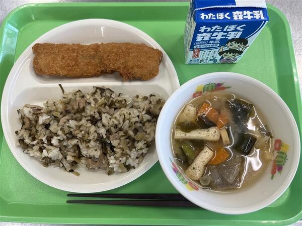 11月は「彩の国ふるさと学校給食月間」でしたので、地場産物や埼玉県の料理などがたくさん給食に登場しました。自分たちが住んでいる埼玉県のことを知ることができましたね。今日は、埼玉県北部で作られている「しゃくし菜漬け」が入った混ぜご飯「しゃくし菜ご飯」です。しゃくし菜のはっぱの形が「しゃもじ」のように見えることから名づけられた野菜で、チンゲンサイの仲間です。しゃくし菜と一緒に埼玉県産の豚肉も入れてつくりました。