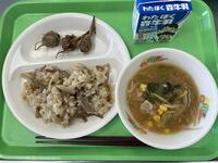 今日は「日本🗾味めぐり給食」です。北海道の名産がたくさん入った「道産子汁」の登場です。「道産子」とは「北海道生まれ」という意味があります。じゃがいも、とうもろこし、バターが北海道の名産です。また、味つけはみそラーメンのスープをイメージしました。北海道は「札幌ラーメン」が有名で、みそ味が定番です。また、今日はさいたま市の特産物の「くわい」の登場です。さいたま市緑区の農家の若谷さんの「くわい」を丸ごと油で揚げました。くわいの大きな芽は「芽が出る」「めでたい」という意味で縁起のよい食べものです。芽も食べられるので食べてみましょう。
