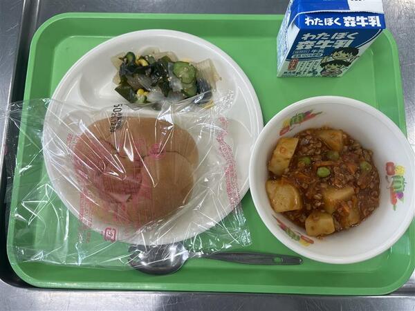今日の主菜は「ポテトのミートソース和え」です。たくさんのじゃがいもを調理員さんが食べやすい大きさに切りました。ミートソースは、豚ひき肉だけではなく、大豆ミートも入れました。豆類が苦手なお友だちもおいしく食べられるように、大豆そのままの形ではなく、お肉のような加工がされている大豆ミートを使いました。また、こんにゃくサラダは、給食室特製のしょうゆ風味のたまねぎドレッシングと和えました。