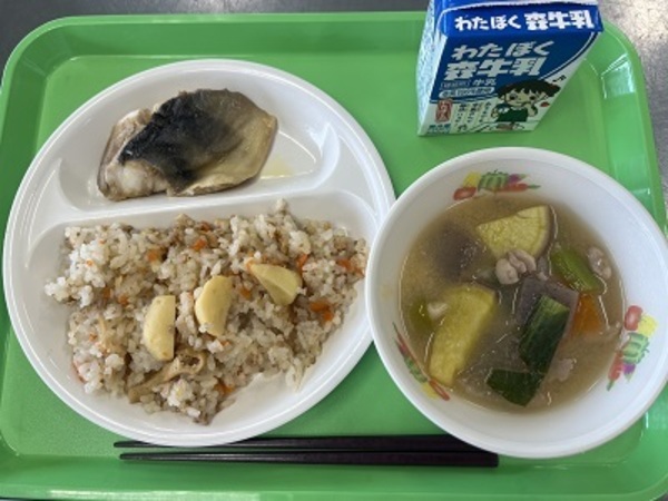今日はさいたま市西区馬宮米部会のお米を使って給食室で「くわいごはん」を炊きました。先週の唐揚げにつづいて、さいたま市緑区の農家の若谷農園の皮が美しい青色の青くわいを使いました。大きめのくわいの皮をむいて食べやすい大きさに切り、調味料で煮てつくりました。お節料理にも使われる野菜です。また、今日の魚は「ホッケ」です。ホッケは寒い冬の海でとれるお魚です。骨に気をつけて食べてください。