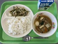 今日の給食は中華丼です。給食の中華丼はたくさんの食材が使われていることが特徴です。入っている食材は、しょうが、たまねぎ、にんじん、たけのこ、干ししいたけ、白菜、チンゲンサイ、ぶた肉、いか、あさり、うずらの卵です。食べものにはそれぞれちがう栄養があるため、色々な種類の食べものを食べるとからだに良いです。また、うずら卵はすぐに飲みこまないで、よくかんでください
