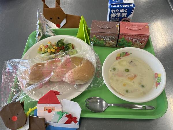 今日の給食はクリスマスメニューです。「米粉のホワイトシチュー」は、にんじんの赤、グリンピースの緑でクリスマスカラーと、ホワイトシチューの白で冬らしい雪をイメージさせました。「クリスマスツリーサラダ」は、ブロッコリーがツリーで、コーンや赤ピーマンをツリーのかざりに見立てました。そして今日は、クリスマスケーキのセレクト給食です。「チョコレート」と「ストロベリー」のどちらかひとつを選びましたね。チョコレートが533こ、ストロベリーが261こでしたよ♪2学期の最後の給食、楽しく、おいしく、いただきましょう🎅🎄