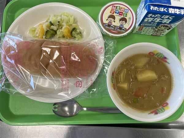 今週は芝川小の学校給食週間なので、「給食の歴史」を学ぶ献立にしました。戦後の主食はほとんど「パン」でした。お米が不足し、アメリカからの小麦と脱脂粉乳の支援が多くあったからです。また、パンによく合うメニューとして脱脂粉乳を使ってつくる「カレーシチュー」は給食の人気メニューでした。また、学校給食の始まりの地「山形県」のりんごを使ったゼリーの登場です🍎(明日は給食の始まりの献立です)