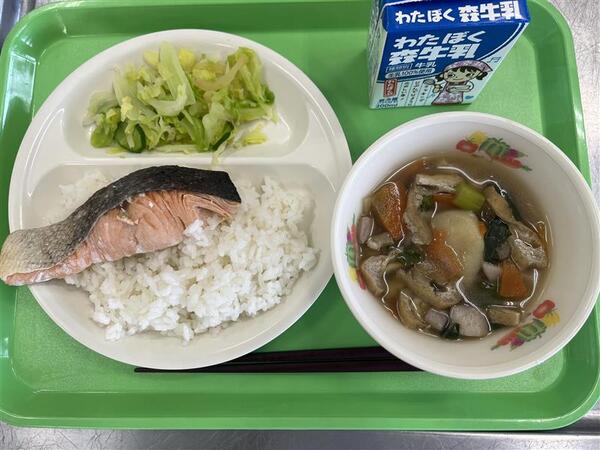 今日も学校給食週間「給食の歴史」を学ぶ献立です。日本の給食は、明治22年山形県鶴岡町の忠愛小学校からはじまりました。生活がくるしい家庭の子どもたちに出されたお昼ご飯でした。内容は、おにぎり、鮭の塩焼き、漬け物だったそうです。今の給食は、栄養の補給はもちろんですが、「食べて学ぶ」ことも目標となっています。当時の給食の再現だと栄養が足りないので、すいとんを追加しました。