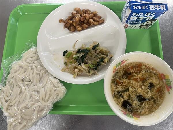 今日の給食は「大豆のしゃりしゃり揚げ」です。大豆に片栗粉をまぶして油でからりと揚げてつくる給食の定番メニューです。時間をかけて、からりと揚げることで、食べる時に「しゃりしゃり」という音がすることから、「しゃりしゃり揚げ」という名前がついています。食べた時の音や味を感じましょう。また、副菜は大根おろしが入った「おろし和え」です。大根は体の中の「胃」の働きによい食べもので、大根おろしは、その働きをさらにパワーアップさせてくれます。今日は大根おろしを食べやすいように、しょうゆ、かつお節と一緒に野菜と和えてつくりました。