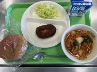 今日は「セルフエビカツバーガー」です。子どもパンに横に切り込みが入っているので、エビカツとキャベツをはさんで食べましょう。また、スープは「アレッタ」が入っています。アレッタは、ブロッコリーとケールからうまれ、苦みも少なく、食べやすい野菜です。熱にも強いので、スープや炒め物にぴったりです。さいたま市西区の馬宮米部会の皆さんがお米の生産が落ち着く今の季節につくる冬の野菜です。