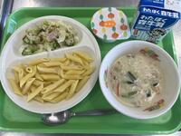 今日の給食は「ペンネ・ほたてときのこクリームソース」です。今日は、えのきたけ、マッシュルームと2種類のきのこ、ほたてが丸ごと入ったクリームソースをつくりました。きのこやほたては、うま味成分も多く、料理をおいしくしてくれるは働きもあります。ペンネとクリームソースを絡めていただきましょう。ペンネはお皿に盛りきらないと思いますので、ソースがなくなる前に上手におかわりしてくださいね♪また、今日のゼリーは「フローズンみかんゼリー」です。「うんしゅうみかん」の冷たいゼリーです。食事の最後に食べると、さっぱりし、甘いおいしさを感じられます。