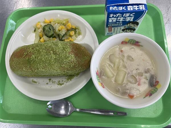 今日のあげパンは、初めて給食に登場する味「抹茶ミルク味」です。埼玉県の名産の「狭山茶」の抹茶と、スキムミルク、砂糖を揚げたてのコッペパンとまぶしてつくりました。抹茶のほろ苦さがスキムミルクと合わさったことでまろやかな仕上がりです。また、「豆乳ポテトチャウダー」は、牛乳ではなく豆乳でつくったシチューよりさらっとした具だくさんのスープです。白花豆のペーストや小さめのひよこ豆が入っているので、豆類をしっかり食べられます♪