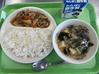 今日の給食は6年生が家庭科の授業で考えた献立の第2弾です。今日は6年2組 渡部そらさんの考えた献立です。選んだポイントは、寒い日のぴったりな「豚キムチ」が主菜であり、わかめスープには冬が旬の長ねぎが入っていることです。さらに、五大栄養素が満たされていてバランスのよい献立です。キムチは韓国でうまれた辛い漬け物で、とうがらしと塩で白菜などの野菜を漬けてつくられます。とうがらしは「カプサイシン」という辛い成分が入っていて、体をあたためてくれる働きがあります。豚キムチは、ご飯もすすむ味なので、しっかり食べて体をあたためましょう。