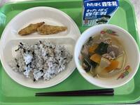 今日の主食は「わかめゆかりご飯」です。わかめゆかりご飯に「ゆかり」という赤しそのふりかけを混ぜてつくりました。赤しそのさわやかな香りを感じてください。また、主菜の「わかさぎ」は、カリカリ食感のフリッターです。丸ごと全部食べられるので、よくかんできれいに食べてください。また、3月は今年度最後の月なので、「また食べたい!」と言ってくれた献立を多く給食に出しています。わかめゆかりご飯、わかさぎフリッターは声をかけてくれたメニューです♪
