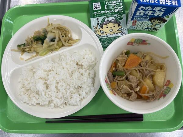 今日から令和8年度の給食がはじまりました。4月の給食目標は、「落ち着いてすばやく配ぜんしよう」です。新しいクラスの給食の決まりを早く覚えて、クラスみんなで協力して楽しい給食の時間にしましょう。新しい学年になったので、給食の量がふえています。心と体の成長する分なので、盛られた分は食べられるようにがんばってみましょうね!今日の給食は、みなさんも食べやすくて、給食室も作り慣れている定番メニューの「肉じゃが」にしました。ごはんもしっかり食べられるように「のりふりかけ」もつけたので、ごはんにかけて食べましょう。