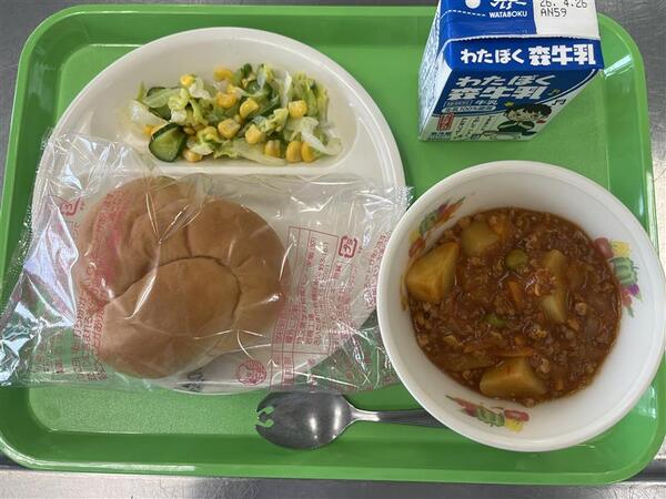 今日から1年生の給食がはじまりましたので、芝川小学校みんなそろっての給食スタートです♪1年生のみなさんで給食を楽しみしていた人もたくさんいると思います。芝川小学校の給食は、およそ810人分の給食を、5人の調理員さんが愛情たっぷり込めて作っています。毎日、いろいろな食べものが登場するので楽しみにしていてくださいね。今日は、はじめて食べる1年生も食べやすい、パンのメニューにしました。パンを「ポテトのミートソース和え」につけて食べるのがおすすめです。パンでおわんをきれいにして食べてくれるとうれしいです♪