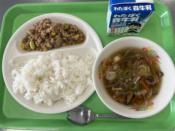 今日の給食は「鶏そぼろ丼」です。鶏ひき肉以外に大豆をお肉のように加工された「大豆ミート」も入れてつくりました。大豆にはお肉に負けない栄養が多いので給食では色々な形になって登場します。今日は、見た目もおいしそうに見えるようにコーンや枝豆を入れてカラフルにしました。ご飯と一緒にいただきましょう。また、汁物は「沢煮椀」です。沢煮椀は、豚肉や野菜を千切りにした具だくさんな汁物のことです。